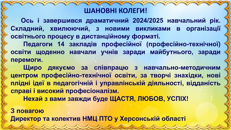 Лариса Гаран, завідувач сектору професійної, фахової передвищої і вищої освіти управління освіти і науки Херсонської ОДА, підвела підсумки виконання регіонального замовлення на підготовку спеціалістів у 2025/2026 навчальному році. Із запланованих 2032 осіб зараховано 1543 (76%). Виконали набір у повному обсязі: Новокаховський професійний електротехнічний ліцей, ПТУ № 14 м.Нова Каховка, ПТУ № 26 смт.Гаврилівка, Каховський професійний аграрний ліцей. 14 закладів професійної освіти області продовжують організацію освітнього процесу в дистанційному форматі.